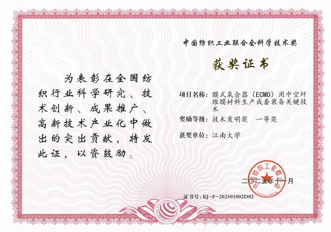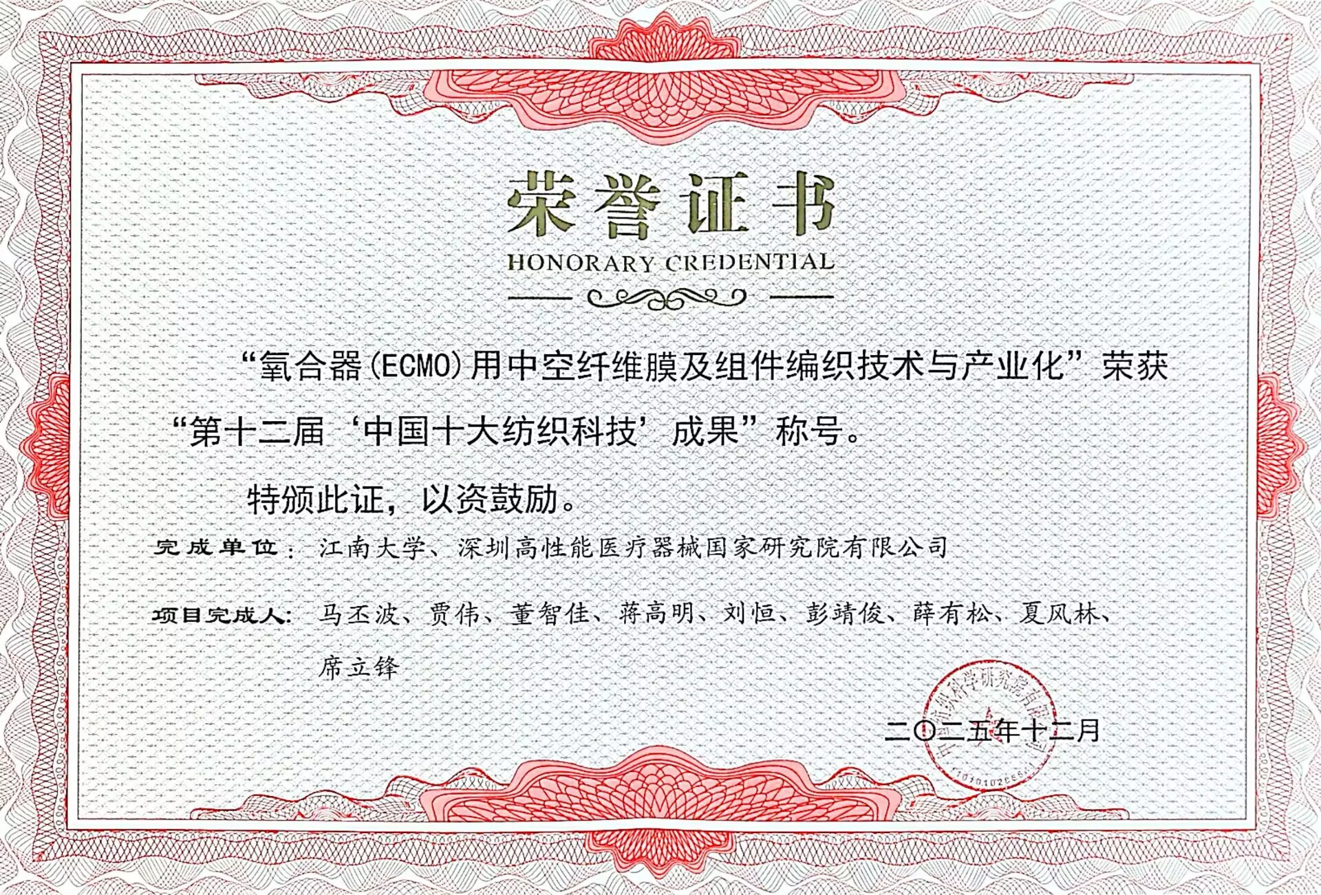 经过征集与层层遴选,由江南大学纺织科学与工程学院马丕波教授领衔,联合深圳高性能医疗器械国家研究院有限公司共同攻关共同研发的“氧合器(ECMO)用中空纤维膜及组件编织技术与产业化”荣获“第十二届中国十大纺织科技成果”称号。