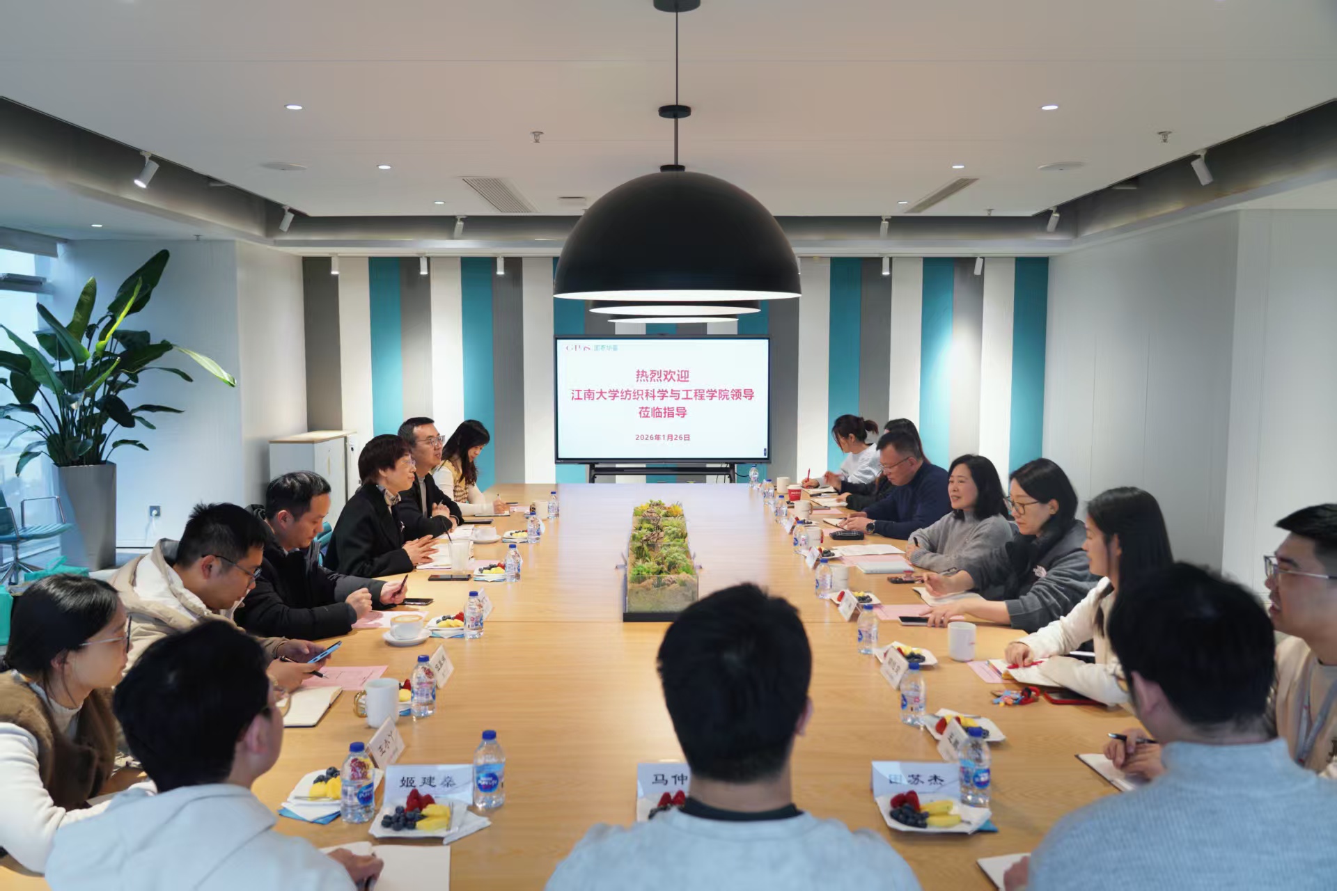 1月26日下午,江南大学纺织科学与工程学院一行赴江苏国泰华盛实业有限公司开展“优企引才”访企拓岗促就业专项活动。学院党委书记张菁燕,党委副书记、副院长王恒,科研院院长助理、校聘研究员吕鹏飞,专职组织员张志新,研究生辅导员伍胤鸿与国泰集团副总裁兼华盛公司总经理朱荣华,总经理助理顾艳,人力资源部主任顾华锋等企业高管及优秀校友代表齐聚一堂,双方围绕人才培养及招聘、产学研合作等议题深入交流,共绘校企协同发展新蓝图。