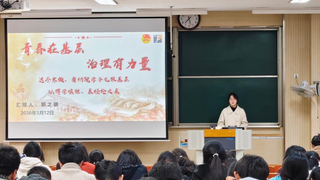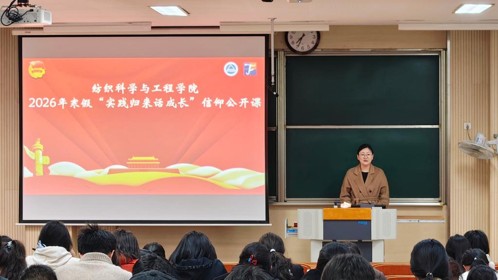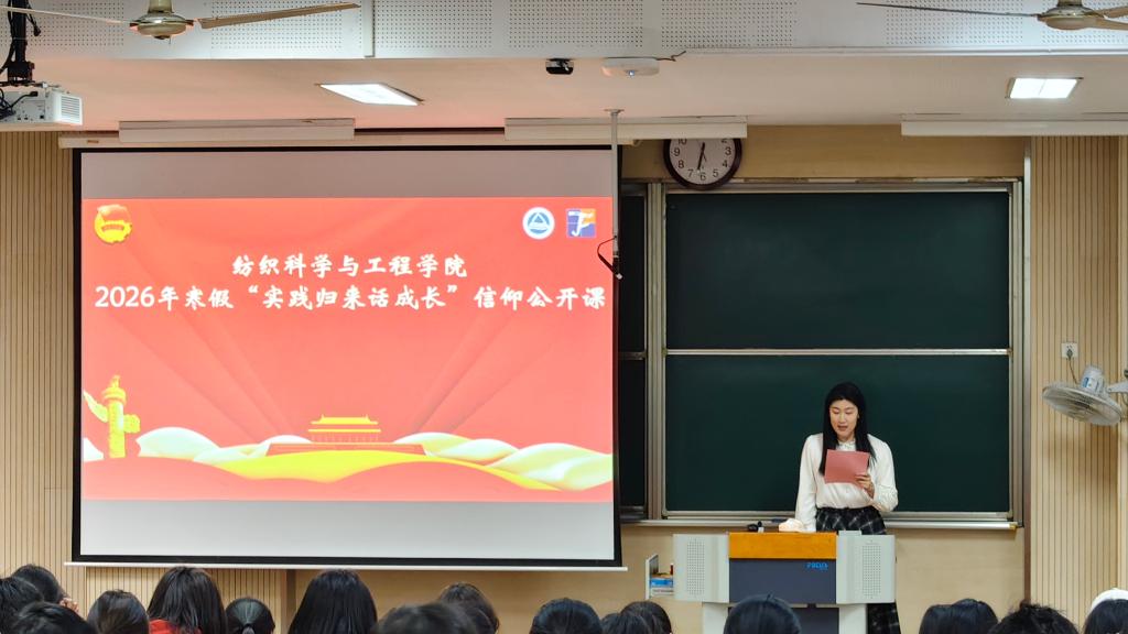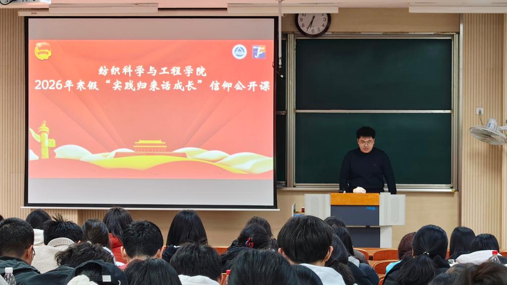 3月12日晚,纺织科学与工程学院于第一教学楼1B103举办2026年寒假“实践归来话成长”信仰公开课。纺织科学与工程学院学工办主任兼分团委书记任学敏、2025级本科生辅导员孙洲龙、2026年寒假社会实践各院级重点团队代表及2025级全体本科生参与此次活动,会议由学院学生会团委通讯社胡婧文淇主持。