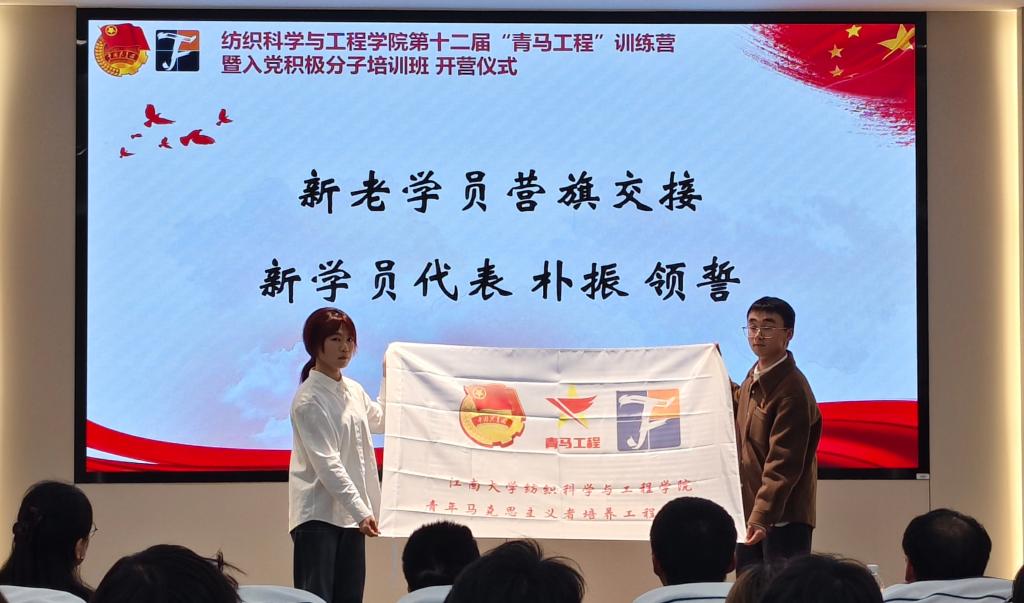 往届优秀学员孙静怡分享心得。她以自身经验和感悟现身说法,鼓励新一届青马学员们带着热情和坚持继续奔跑,为实现中华民族伟大复兴的中国梦注入纺织力量。 随后,孙静怡为第十二届青年马克思主义者培养工程训练营学员授旗,学员代表朴振带领全体学员宣读誓词。