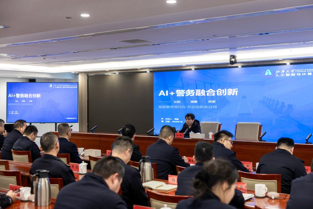 在经开分局副局长许华等人员的陪同下,学院一行首先参观了贡湖大道警务工作站,实地了解基层智慧警务建设情况。随后,学院教师范超应邀在经开分局主办的“经纶”大讲堂(第1期)上作题为《AI+警务融合创新》的专题讲座,受到与会人员的广泛关注。