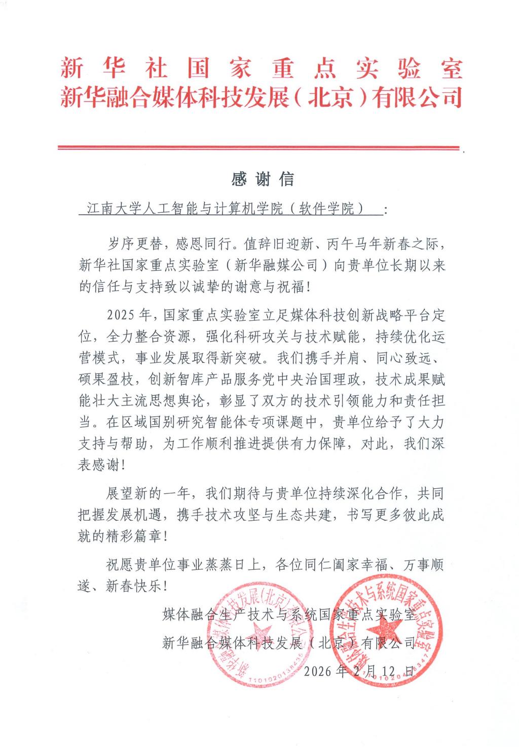 近日,江南大学人工智能与计算机学院(软件学院)收到来自媒体融合生产技术与系统国家重点实验室(新华融媒公司)的感谢信,对学院长期以来在科研合作、技术支撑等方面给予的大力支持表示诚挚感谢,并特别肯定了学院在“区域国别研究智能体”专项课题中的突出贡献。