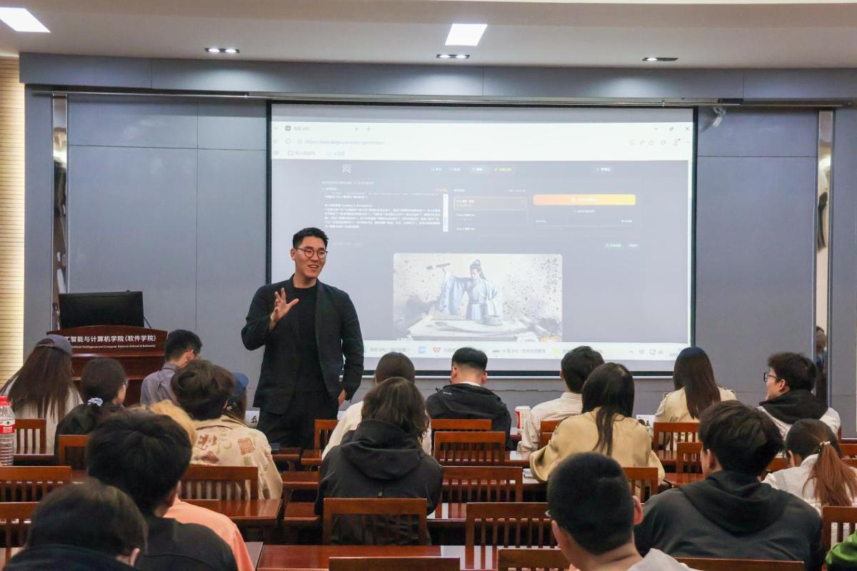 李昇以Pieter Levels、Open Claw等行业经典案例为切入点,生动阐释了OPC模式“一人+N个AI=无限可能”的核心逻辑,明确指出AI技术的核心价值并非取代人类,而是作为赋能工具,让善于运用AI的人更具核心竞争力。结合自身创业经历,李昇分享了自己从数学专业跨界,先后涉足气象预报、物流AI应用领域的奋斗历程,重点讲述了如何运用AI技术实现团队“轻量化”运营,以10人团队高效完成传统百人规模工作量的实战经验,让在场学子对AI的落地应用有了直观认知。讲座现场,李昇还现场演示了AI智能体、图片生成、视频创作、定制音乐等实用工具的操作方法,直观展现了AI技术低成本、高效率落地创业的强大能力,鼓励学子们打破专业壁垒,主动借助AI技术赋能传统行业,牢牢把握科技浪潮带来的黄金发展机遇。