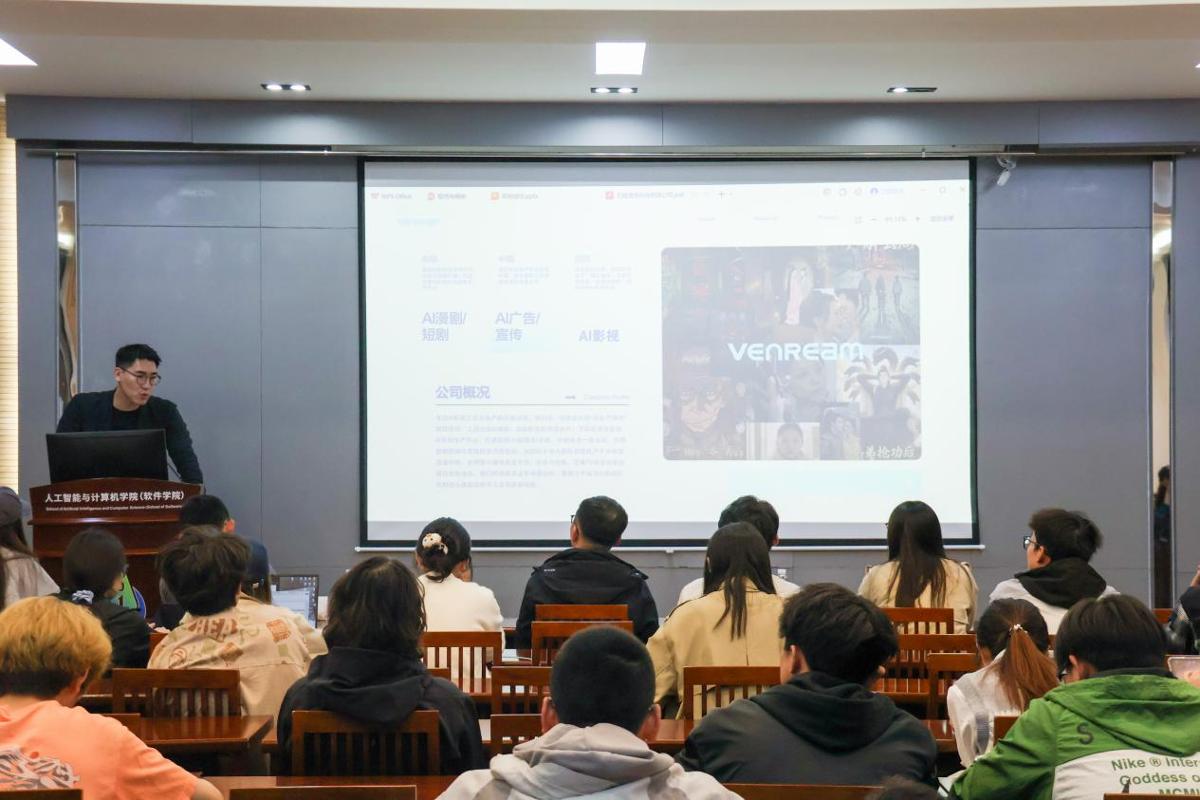 陈佳程围绕“AI影视工业化与青年创业机会”主题展开分享。作为跨领域创业的优秀代表,陈佳程从金融投资领域成功转型AI影视赛道,凭借自主研发的全链路AI影视生产平台,实现了以极小团队规模高效产出精品短剧、动漫、广告宣传片等优质内容。他强调,审美与内容理解能力将成为AI时代的核心竞争力,技术决定效率下限,工业化水平决定规模上限,鼓励有创意、懂审美的青年学子积极投身AI内容创作领域,以创意结合技术,实现个人价值与行业发展的同频共振。