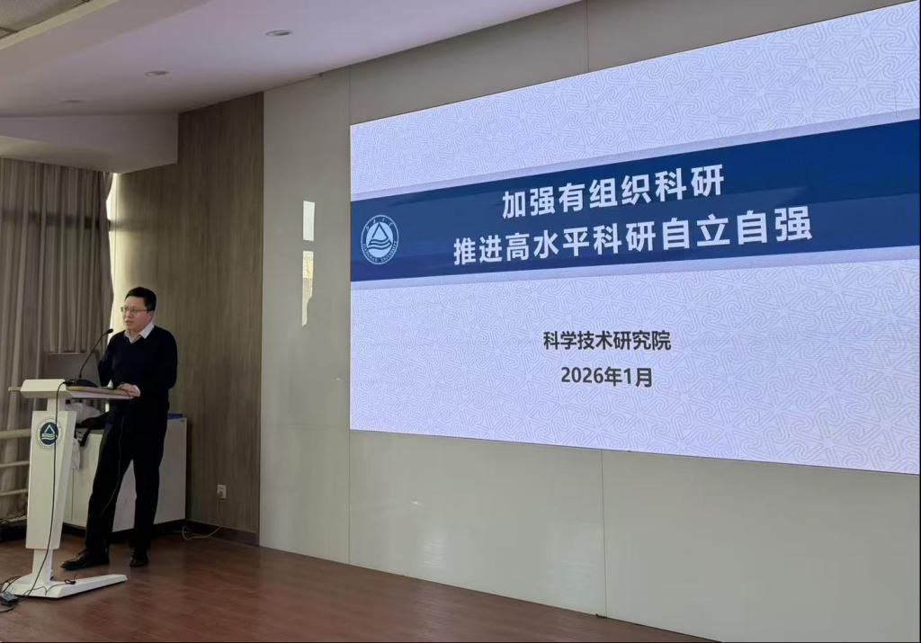 科学技术研究院院长东为富以《加强有组织科研 推进高水平科研自立自强》为题作专题报告。报告深入分析了新时代高校科技创新的使命与要求,强调要坚持“四个面向”战略导向,强化有组织科研布局。东为富指出,“十五五”时期,国家将在新能源、新材料、航空航天等领域加大布局,学院应主动对接国家战略需求,在精细化工、先进材料等优势领域加强体系化攻关。他结合学校2025年科研经费突破15.6亿元、国家自然科学基金立项170项等亮眼数据,鼓励学院进一步优化科研组织模式,提升服务国家重大需求的能力。