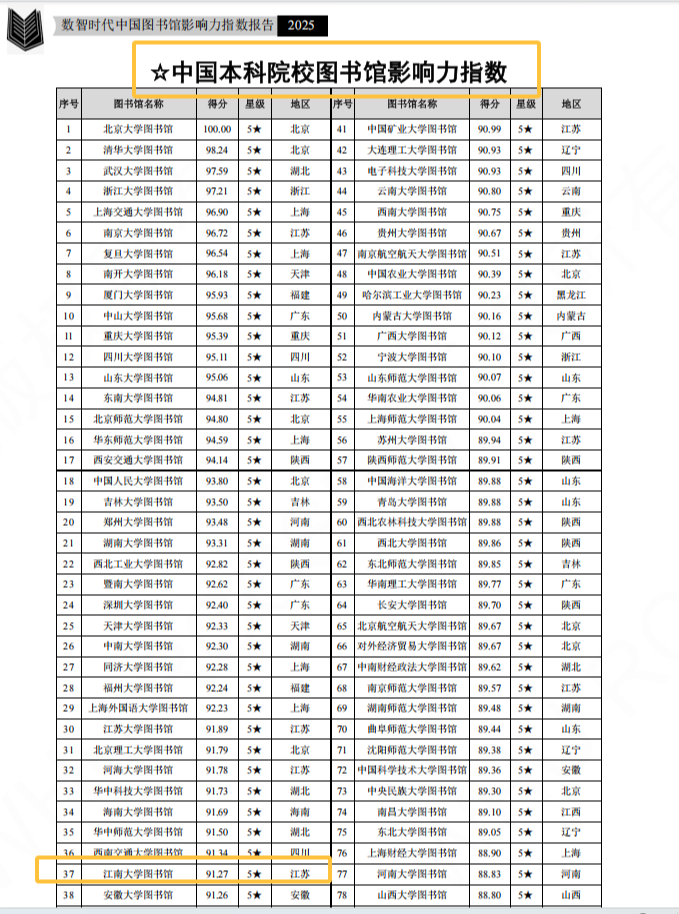 12月29日,由武汉大学中国科学评价研究中心、数字出版智能服务技术教育部工程研究中心联合研发的《数智时代中国图书馆影响力指数报告(2025)》正式发布。报告以“基础实力、网站影响力、新媒体影响力、社会影响力、学术影响力”五个维度为核心,构建科学、全面、动态的评价体系,旨在客观反映我国图书馆在数智化转型中的发展态势与服务成效。报告显示,江南大学图书馆位列全国本科院校图书馆影响力第37位,“双一流”高校图书馆影响力第35位,学术影响力已跃升至全国高校图书馆第15位,并再次获评5星等级,彰显出我校图书馆在数智时代较强的综合影响力与服务能力,也真实反映出业界对我校图情工作的充分肯定。