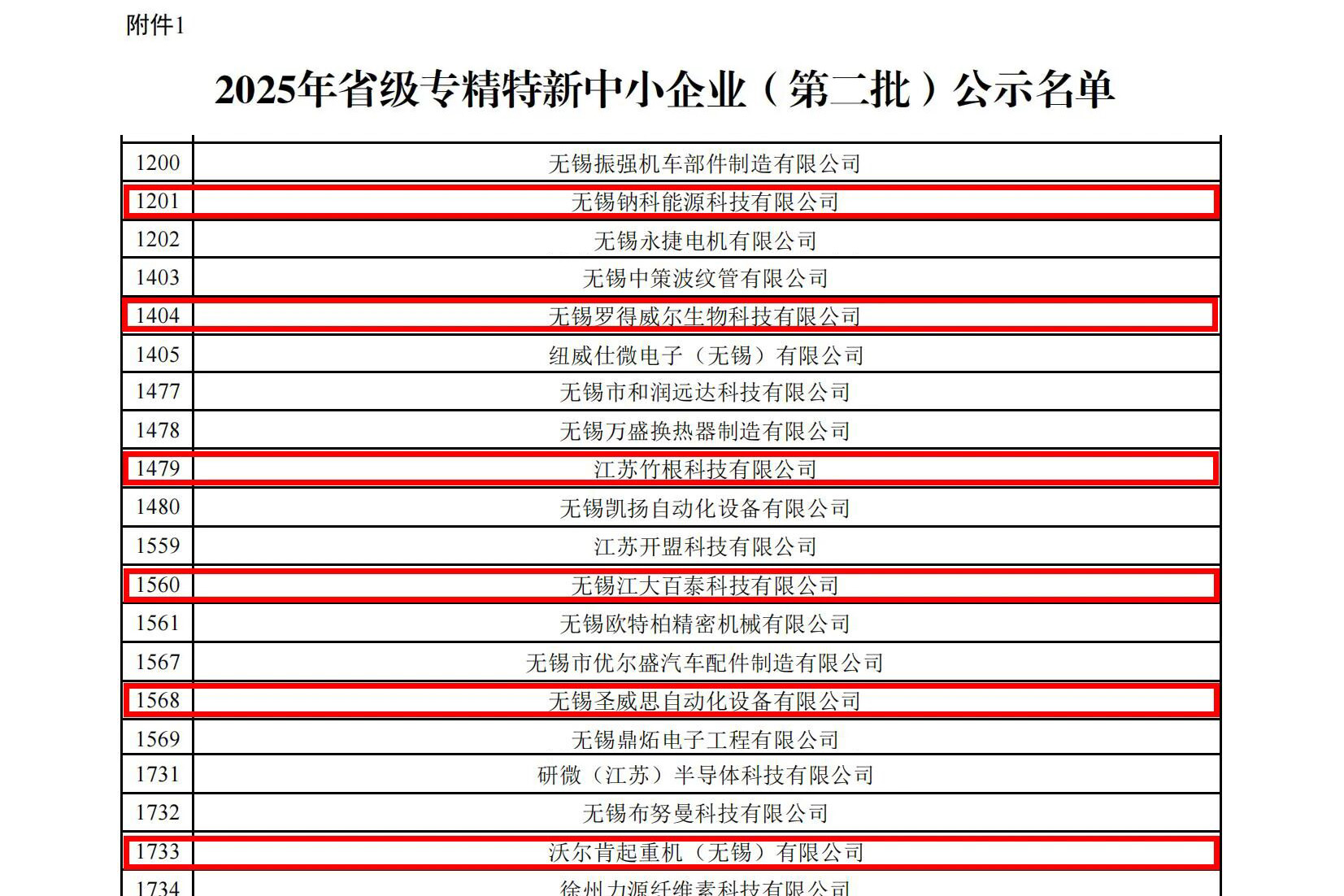 近日,江苏省工业和信息化厅公示了2025年度省级“专精特新”中小企业(第二批)认定及复核结果,园区企业无锡罗得威尔生物科技有限公司,园区孵育毕业企业无锡圣威思自动化设备有限公司、沃尔肯起重机(无锡)有限公司、无锡江大百泰科技有限公司、无锡钠科能源科技有限公司、江苏竹根科技有限公司成功入选,跻身全省优质中小企业梯度培育序列。