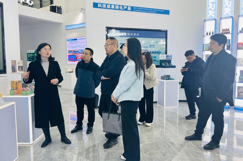 胡长春一行首先参观了江苏省概念验证中心(江南大学生命健康领域)展厅,陈雪梅详细介绍了中心在生命健康领域的概念验证流程、项目遴选机制、验证服务模式及成果转化成效。