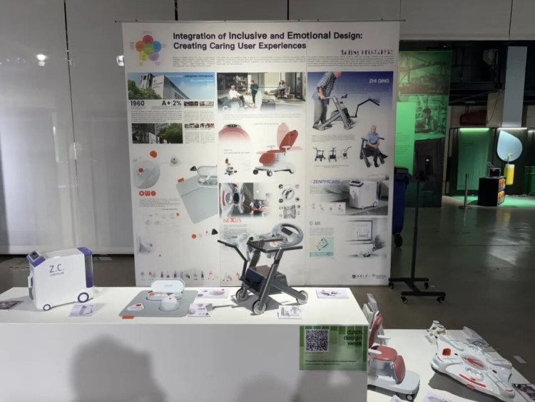 此次江南大学设计学院的参展主题为“包容性设计与情感设计的融合-打造关怀用户体验”,精心挑选了健康福祉方向的代表作前来参展,包括为老年工作者设计的办公产品、智能机械臂助行器、兼具智能陪伴与紧急救助功能的轮椅、适老化的认知训练产品、失能老人的助浴产品、以及办公室健身交互产品等等。