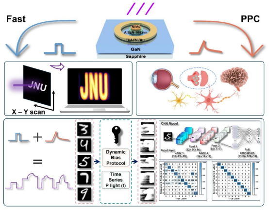 【学习强国11月28日】11月27日,记者从江南大学获悉,该校理学院教授杨国锋团队在宽禁带多功能光电子器件领域取得重要进展。团队提出了一种基于偏压调控实现神经形态计算与硬件加密成像的多功能器件方案,该方案具有实现单器件多功能集成、低功耗与高安全性的优势。相关成果日前发表在国际学术期刊《先进光子学》上。