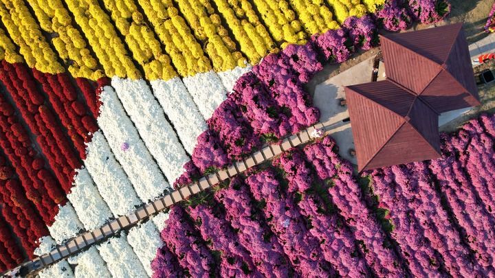 在江苏射阳县洋马镇拍摄的第二十八届洋马菊花节现场(无人机照片)。新华社记者 柳文惠 摄