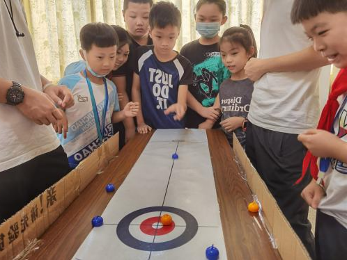 图为团队成员在晓丰社区带领小朋友进行桌面冰壶的现场。中国青年网通讯员 徐一轩 供图