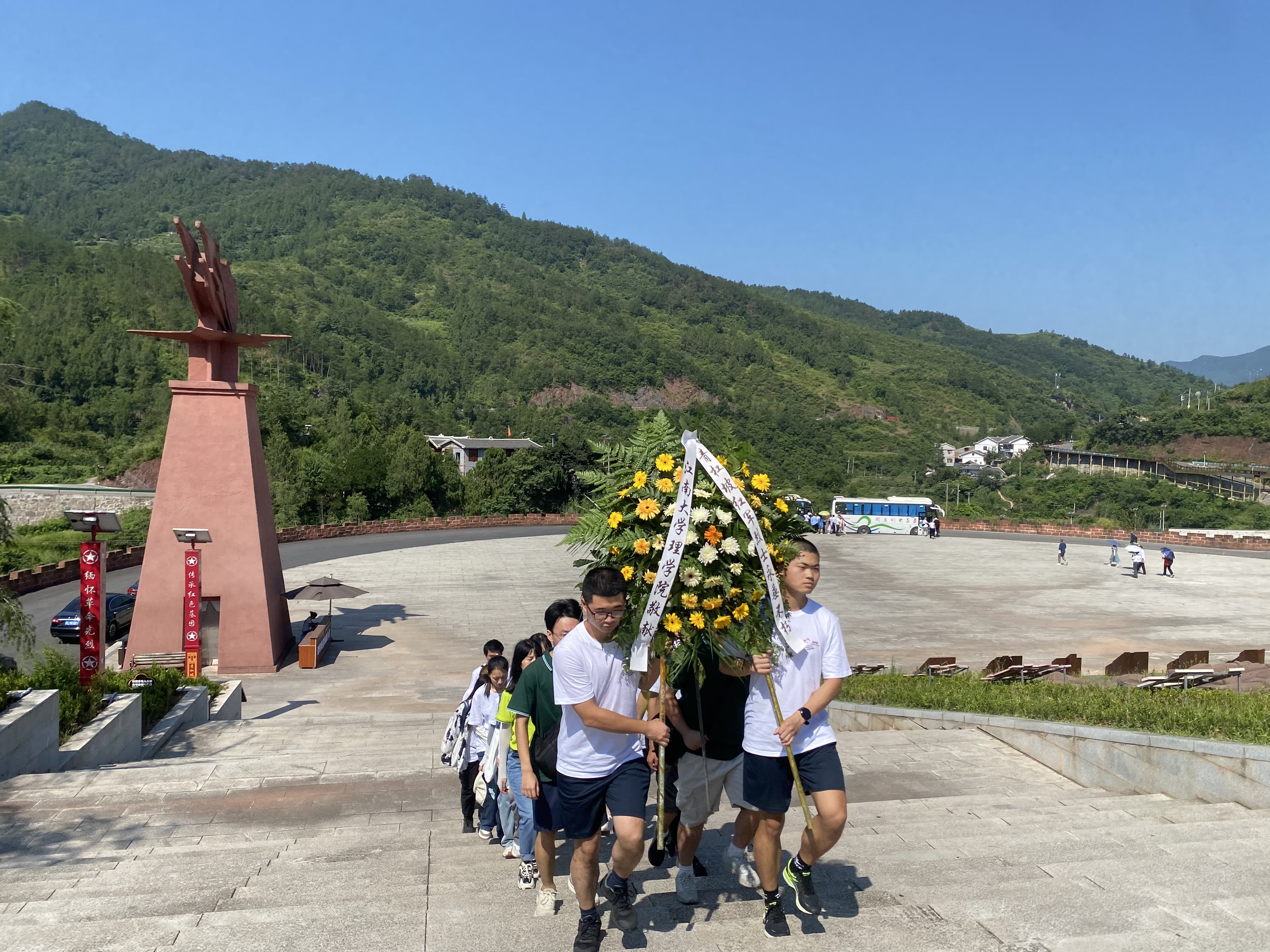 图为“蓝阶梯”乡村振兴实践团参观青杠坡战斗遗址向革命先辈敬献花篮。中国青年网通讯员 王明礼 供图