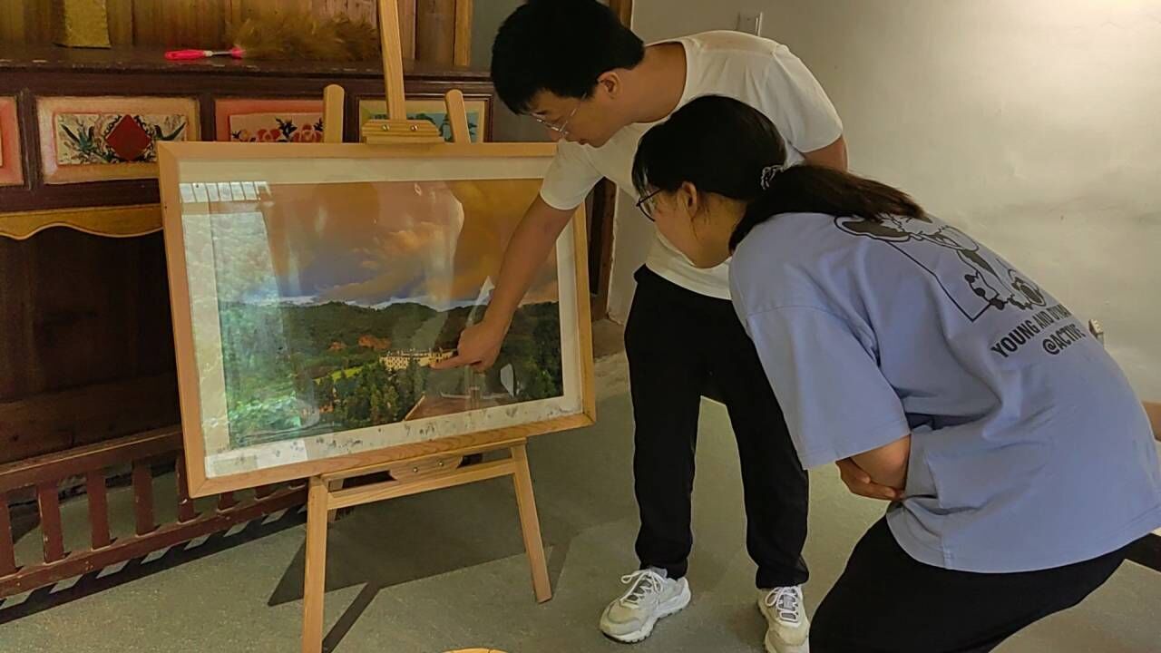图为团队成员在民宿的文化展示馆中,了解麟潭乡林木分布情况。中国青年网通讯员 江赛金 摄