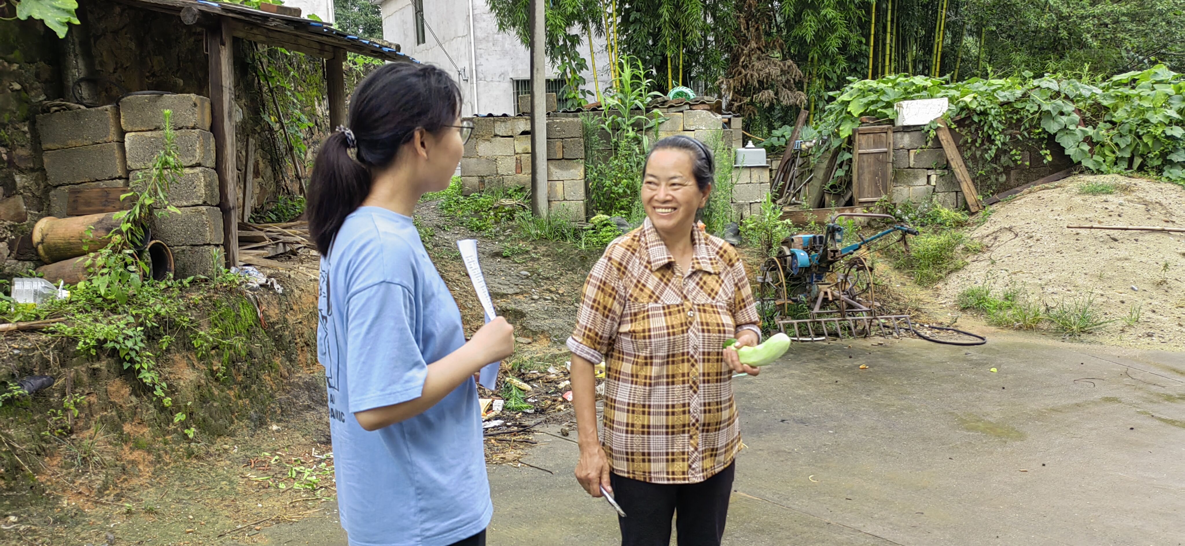 图为团队成员与当地林农交谈,了解林业碳汇发展对他们生活产生的影响。中国青年网通讯员 江赛金 摄
