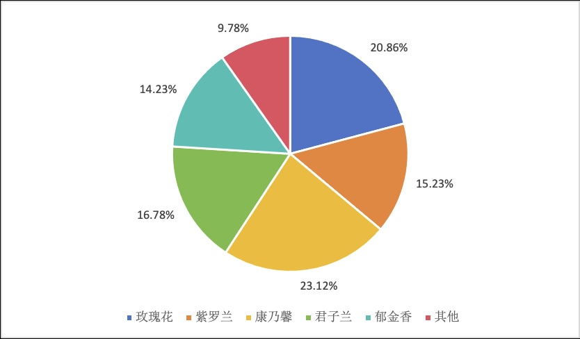 花卉购买种类较为固定,玫瑰花,康乃馨,紫罗兰,君子兰,郁金香等家喻户晓的花种仍占据大部分人的视野认知,新兴品种,小众品种被推广的机会相对较少。
