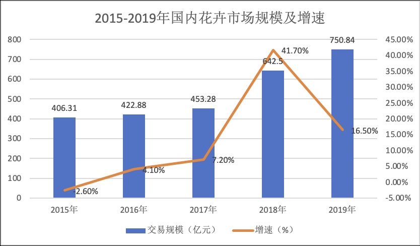图1.1:2015--2019年国内花卉市场规模及增速