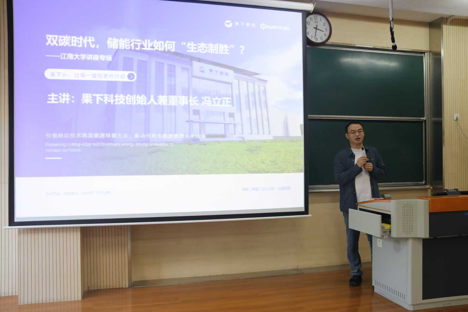 冯立正2012年毕业于江南大学机械工程及自动化专业,是我校首届至善生,其作为新能源储能领域的实战派领军人物,自2019年创立果下科技以来,带领团队以“AI+储能”技术突破全球市场,公司三年营收复合增长率高达168.9%,仅用五年实现年营收超10亿元,推动企业跻身全球储能系统供应商前十。讲座中,冯立正分析了在全球能源转型与“双碳”战略深入推进的浪潮中,储能行业正从政策驱动迈向市场驱动的全新阶段。2025年政府工作报告将新型储能定义为“能源转型的战略引擎”,随着政策与市场的持续推动,技术创新与生态协同成为行业竞争的核心。冯立正结合自身创业历程,讲述从单一企业的创业困境到“生态资源互补破局”,为江南学子深度解析储能创新生态联合的构建逻辑与资源整合路径。