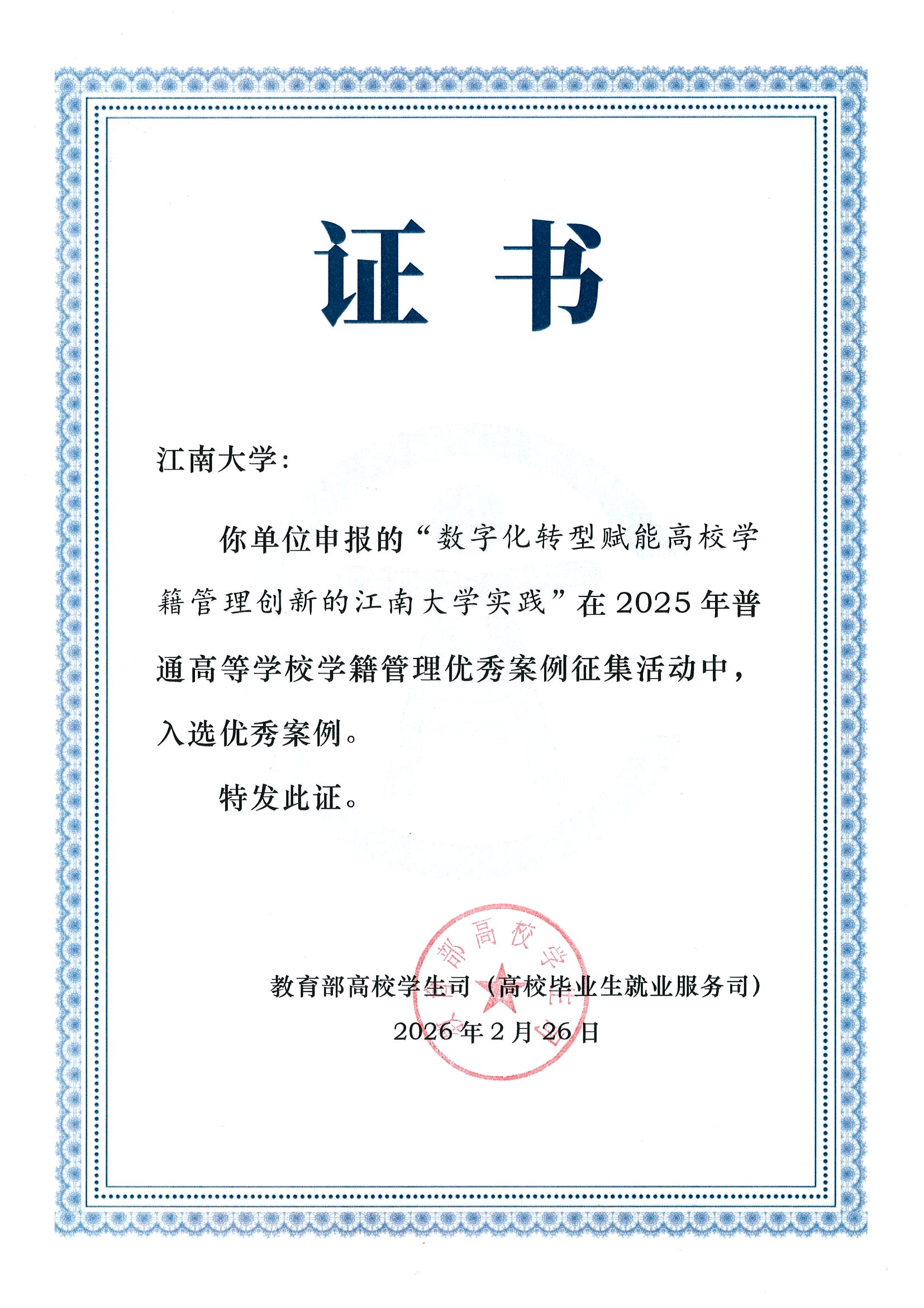 近日,我校《数字化转型赋能高校学籍管理创新的江南实践》案例获评教育部优秀案例。作为教育部直属“双一流”建设高校,学校针对“一校三区”办学格局下传统学籍管理模式效率低、数据孤岛多、服务体验差等痛点,以教育信息化2.0为指引,于2023年启动“智慧学管”建设工程,通过系统性改革实现学籍管理从“事务性束缚”向“数字化赋能”的跨越式升级,为全国高校数字化转型提供了创新范本。