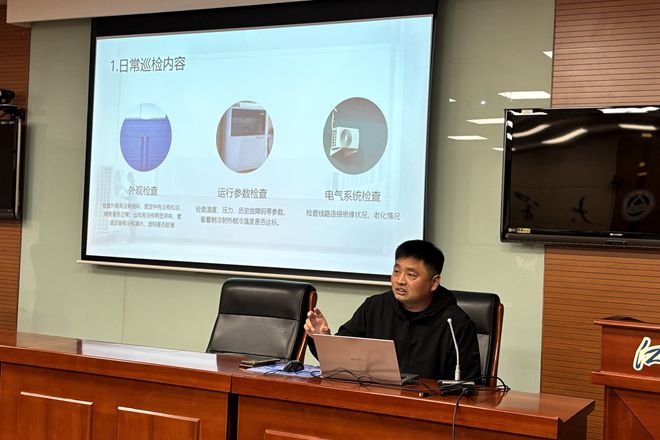 培训中,张文峰围绕中央空调四大核心模块展开详细讲解,明确了我校常用的VRV多联机、单元机及冷水机组的类型、适用场景与核心工作原理,系统梳理了日常巡检、定期大保养、主机保养的关键要点,强调维护记录需完整准确及时及突发故障快速响应要求;同时解读了大金、日立、美的、东芝四大品牌故障代码含义,剖析了制冷不足、漏水、噪音异常、电气故障等典型问题的成因与解决办法,还介绍了冷却塔系统的分类、结构及补水检查、风机维护、清洁滤网等定期维保操作的专业知识。