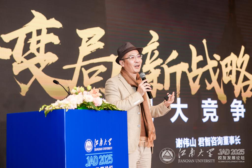 君智战略咨询创始人、董事长谢伟山校友作《新变局·新战略·新未来——破局大竞争时代》主旨报告。张影陆为谢伟山颁发“江南大学青年校友创业者协会”创业导师聘书。