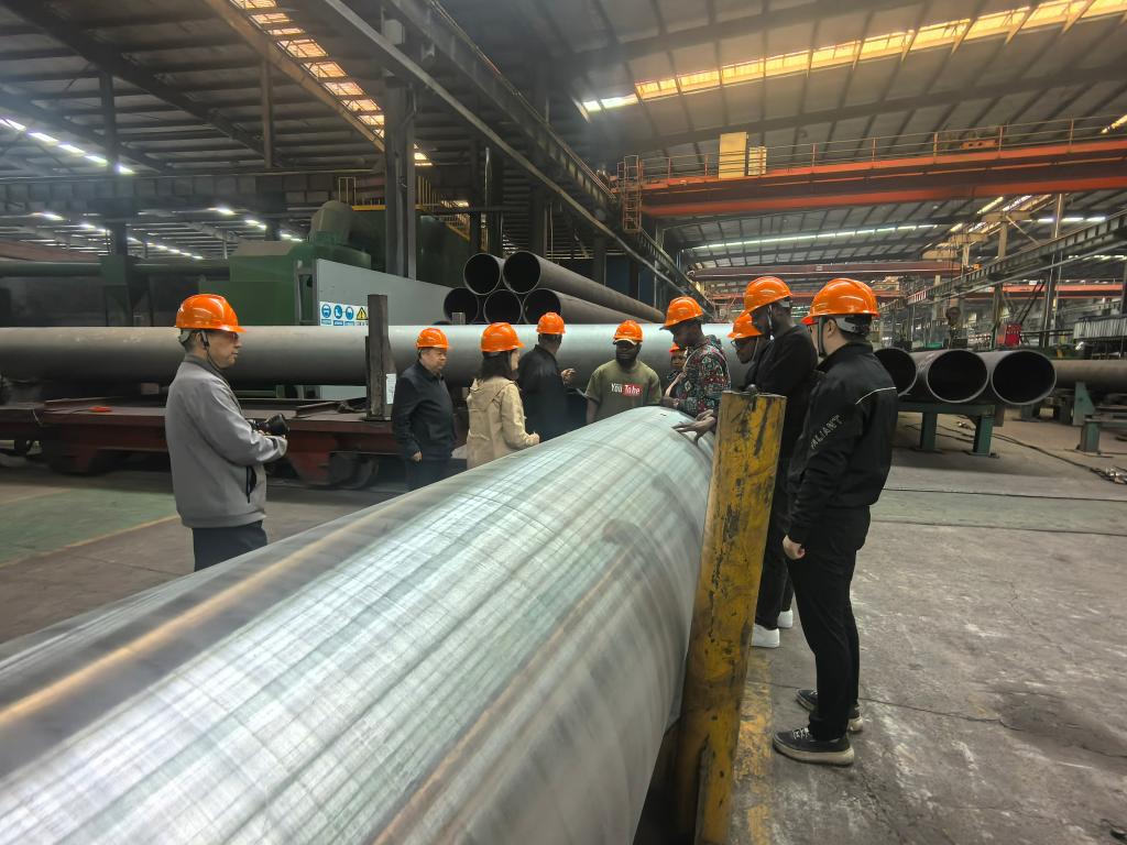 德新钢管董事长陈俊德亲自接待并出席座谈会,细致询问了同学们在校的学习进展与生活情况,认真听取了他们在华求学的感受与收获,并鼓励大家珍惜在华学习机会,未来成为中尼友好交流的使者。随后,陈俊德详细介绍了德新钢管的发展历程、核心业务及技术优势,并特别回顾了企业与尼日利亚市场的长期合作成果,分享了在尼日利亚的项目经验与未来合作愿景。随后,学生们在企业工作人员的引导下参观了生产车间与产品展示区,实地了解了钢管制造流程、质量控制及出口业务运作模式。