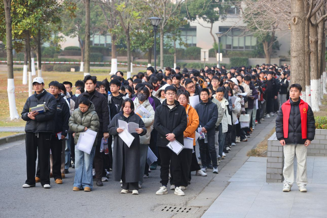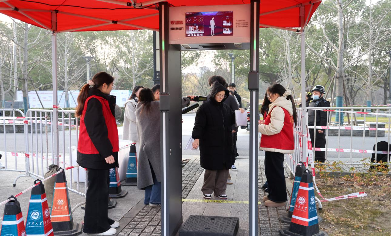 三是强化服务保障。我校坚持以考生为中心,围绕交通、用餐、休憩、医疗等方面推出系列暖心举措,全力营造舒心、温馨的考试氛围。考前及时在“江南大学”公众号、“江南大学研究生院”网站等多渠道发布考试安排、政策解读及温馨提示,提供便捷实用的考试信息服务;线下组织志愿者队伍在路线沿途、考点入口、手机柜存放点等粘贴道路指引标志标识,确保考生快速找到考场。考试当天,300余名江南“红马甲”志愿者在寒冬坚守岗位,与考务人员一起全程给考生提供考场查询、教室指引、物品存取引导、温暖送考等温馨服务。学校联合顺丰公司在安检区外搭建帐篷,为考生免费提供行李存放服务。校医院医护保障组为身体不适考生提供医疗保障,安保人员加大考场周边候场引导,物业工作人员及时响应考生需求,此外,学校开放文浩科学馆、食堂等场所供考生休息,确保考生安全用餐。