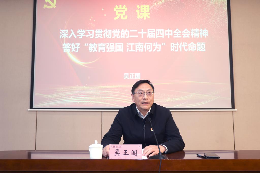 会上,校党委书记吴正国紧密围绕当前形势和学校改革发展实际,以“深入学习贯彻党的二十届四中全会精神 答好‘教育强国 江南何为’时代命题”为主题,讲授专题党课。他结合《中共中央关于制定国民经济和社会发展第十五个五年规划的建议》,深刻阐释了新时代高校肩负的历史使命和实践路径,指出要坚持党对高等教育的全面领导,牢牢把握教育的政治属性,坚守为党育人、为国育才的初心使命;要将办好人民满意的教育作为根本立场和价值追求,深刻把握教育的人民属性,全面落实立德树人根本任务;要主动对接科技创新、产业发展和国家战略需求,充分发挥教育的战略属性,深化教育、科技、人才一体化发展,为中国现代化建设提供有力支撑。他强调,机关全体党员要以此次大会为契机,进一步强化理论武装、提升政治能力,铸牢政治忠诚之魂,建设信念坚定的表率机关;要进一步笃行求实、开拓创新,扛实改革发展之责,建设担当作为的表率机关;要进一步提升服务效能、强化作风建设,涵育勤廉奉献之风,建设作风过硬的表率机关。