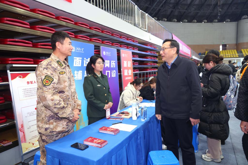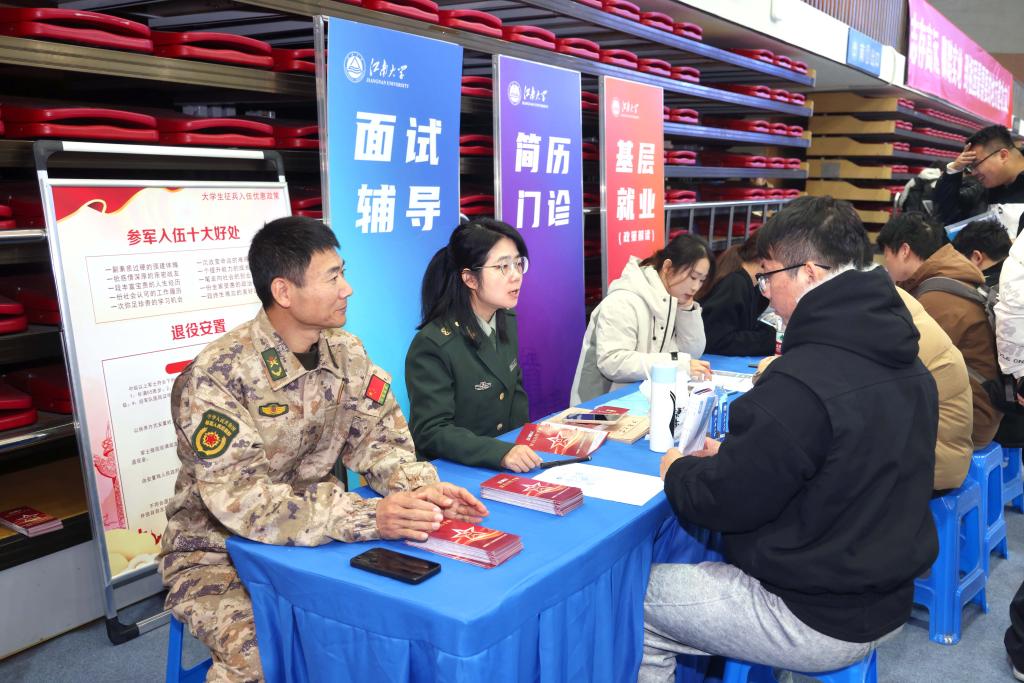 12月23日,我校“暖冬送岗”——2026届毕业生“研后专场”校园招聘会在蠡湖校区体育馆举行。学校人民武装部在招聘会现场设立征兵政策咨询台,开展2026年征兵专项宣讲活动,精准对接考研结束后有就业与入伍规划的毕业生,正式吹响新年度校园征兵精准动员的号角。