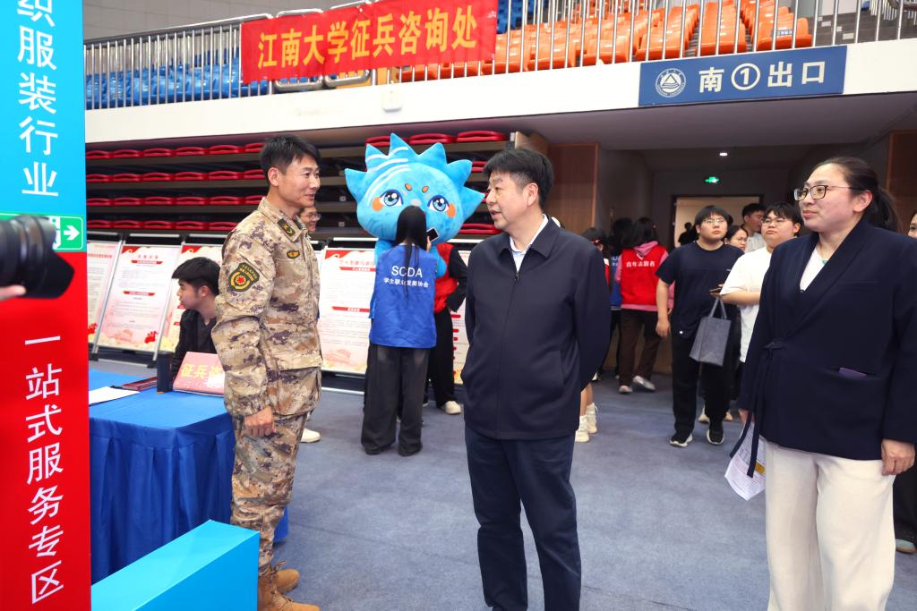 3月29日,我校2026届毕业生春季大型招聘会在蠡湖校区体育馆顺利举行。学校人民武装部在现场设立征兵政策咨询专区,组织我校退役大学生士兵参与现场工作,开展 2026年征兵宣传服务,为毕业生搭建政策咨询、入伍规划的便捷平台,持续推进年度征兵精准动员工作。