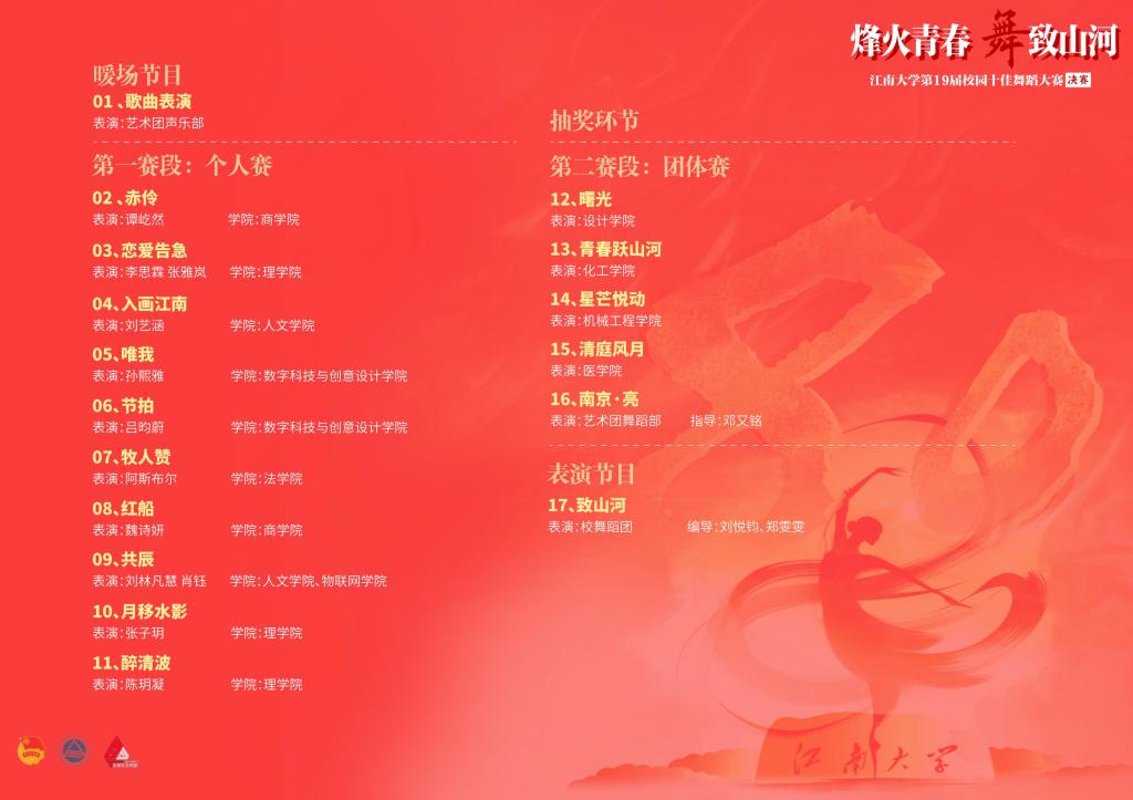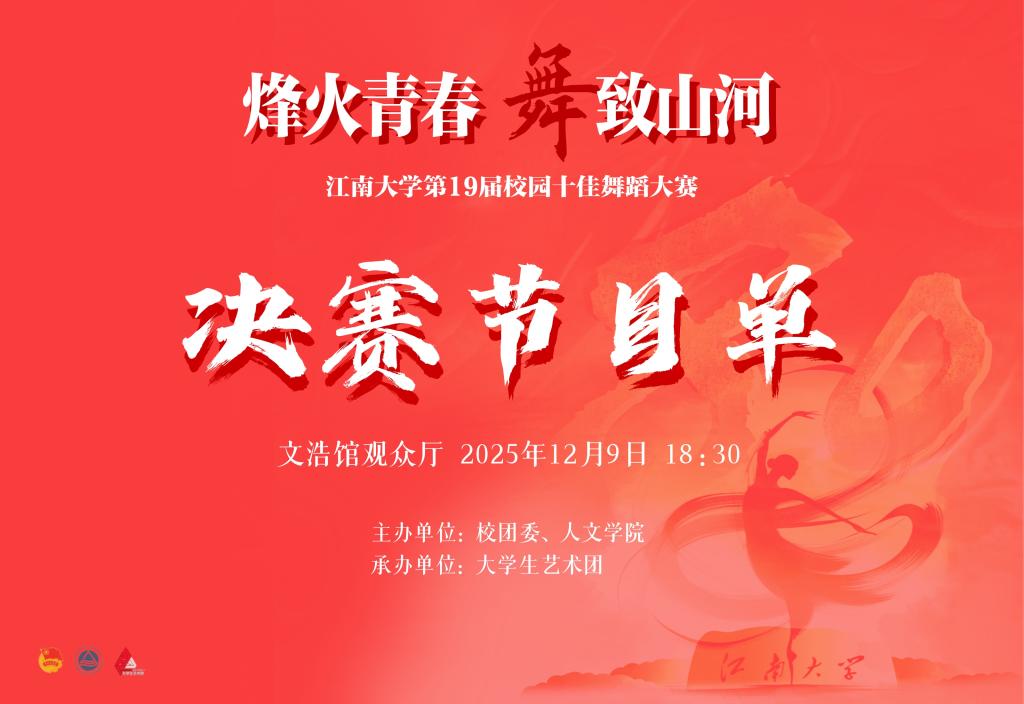 为贯彻落实全国教育大会精神,深入实施美育浸润行动,提升大学生艺术素养,深入学习贯彻习近平总书记在纪念中国人民抗日战争暨世界反法西斯战争胜利80周年大会上的重要讲话精神,传承红色血脉、大力弘扬伟大抗战精神,将思想政治教育融入美育活动中,激发学生对舞蹈艺术的兴趣,广泛开展舞蹈艺术实践活动,推进校园文化建设,特举办第十九届校园十佳舞蹈比赛,现将决赛观赛事宜通知如下: