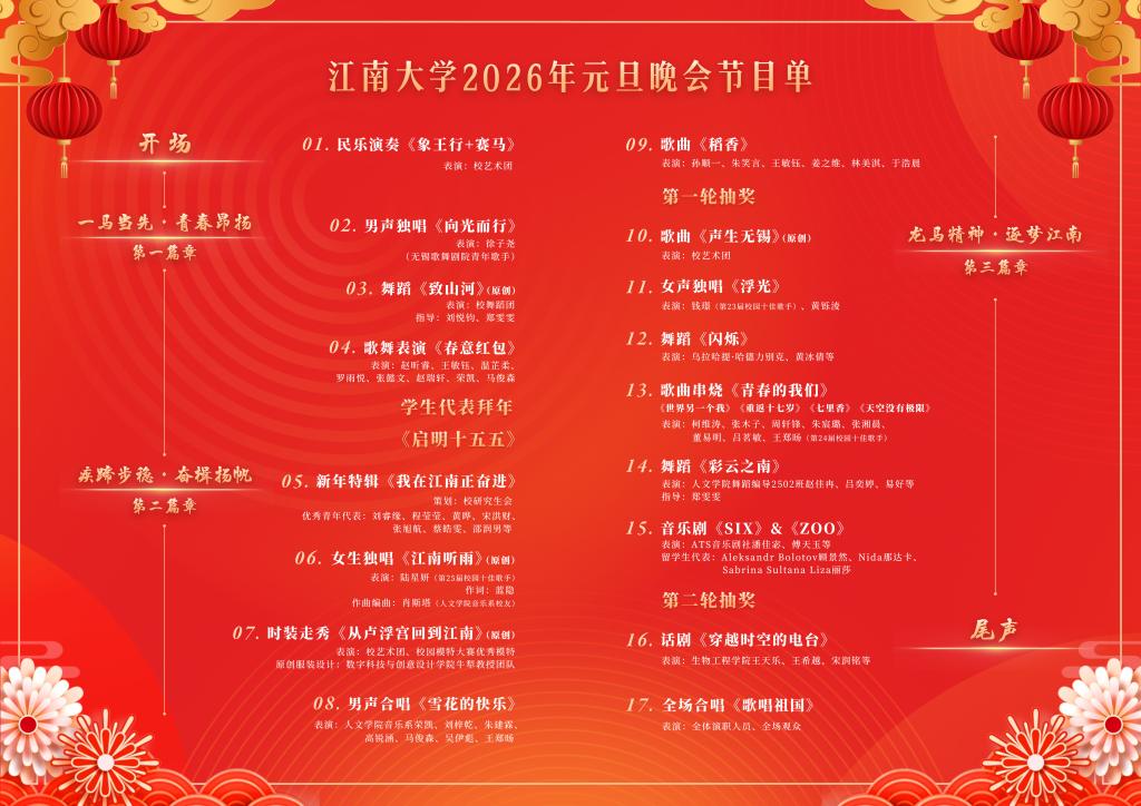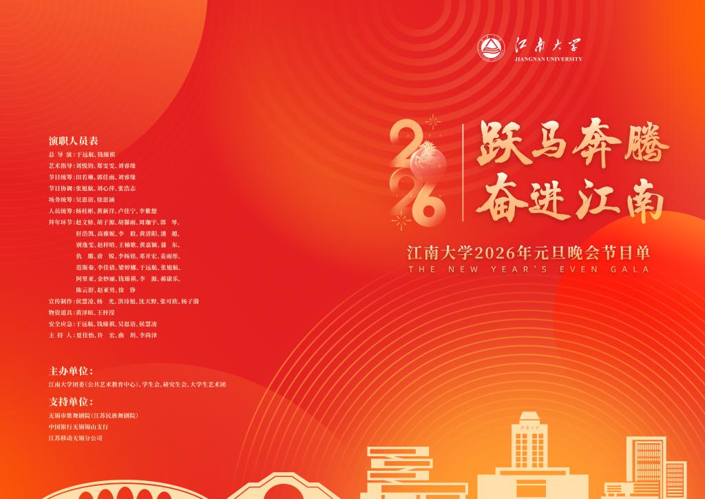 为贯彻全国教育大会精神,深入推进美育浸润行动,传承学校在元旦新年前夕举办庆祝活动的优良传统,喜迎丙午马年,激发全校师生在“十五五”开局之年再攀高峰的澎湃热情,鼓舞江南人策马扬鞭、奋进新征程,丰富师生校园文化生活,特举办2026年元旦晚会,师生观看晚会的具体安排如下: