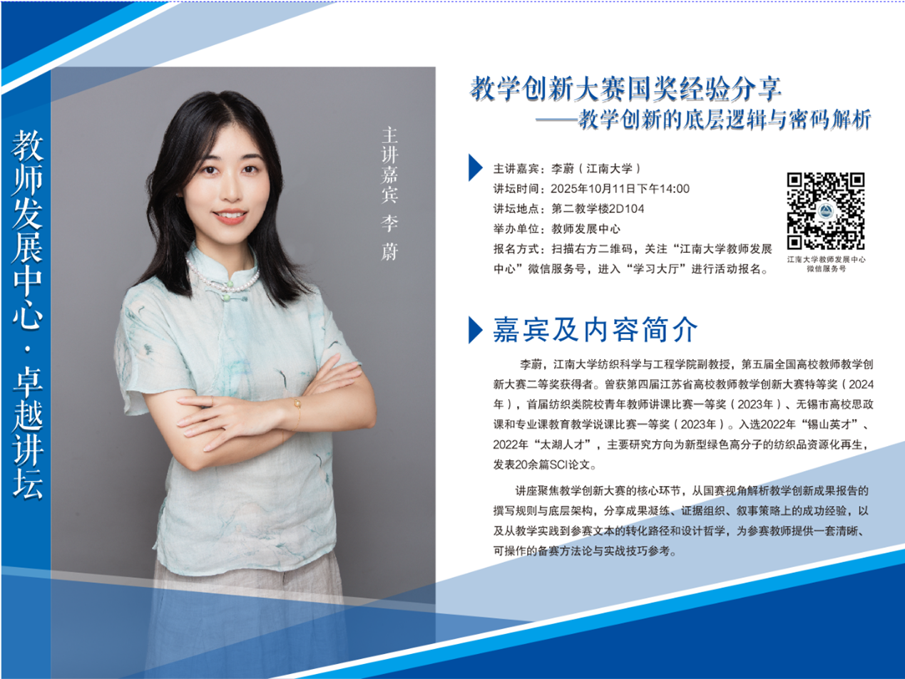 报名方式:扫描下方二维码,关注“江南大学教师发展中心”微信服务号,进入“学习大厅”进行活动报名。