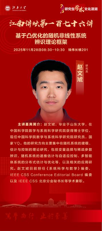 赵文虓,毕业于山东大学,在中国科学院数学与系统科学研究院获得博士学位,现任中国科学院数学与系统科学研究院研究员,国家YQ。研究方向主要集中在随机系统的建模、估计与控制的理论研究,包括变量选择与稀疏参数辨识、随机系统的递推估计与自适应控制、多智能体系统的分布式估计与优化等以及相关的应用研究。赵文虓目前担任《系统科学与数学》编委,IEEE CSS Conference Editorial Board编委以及 IEEE CSS 北京分会秘书长等学术兼职。