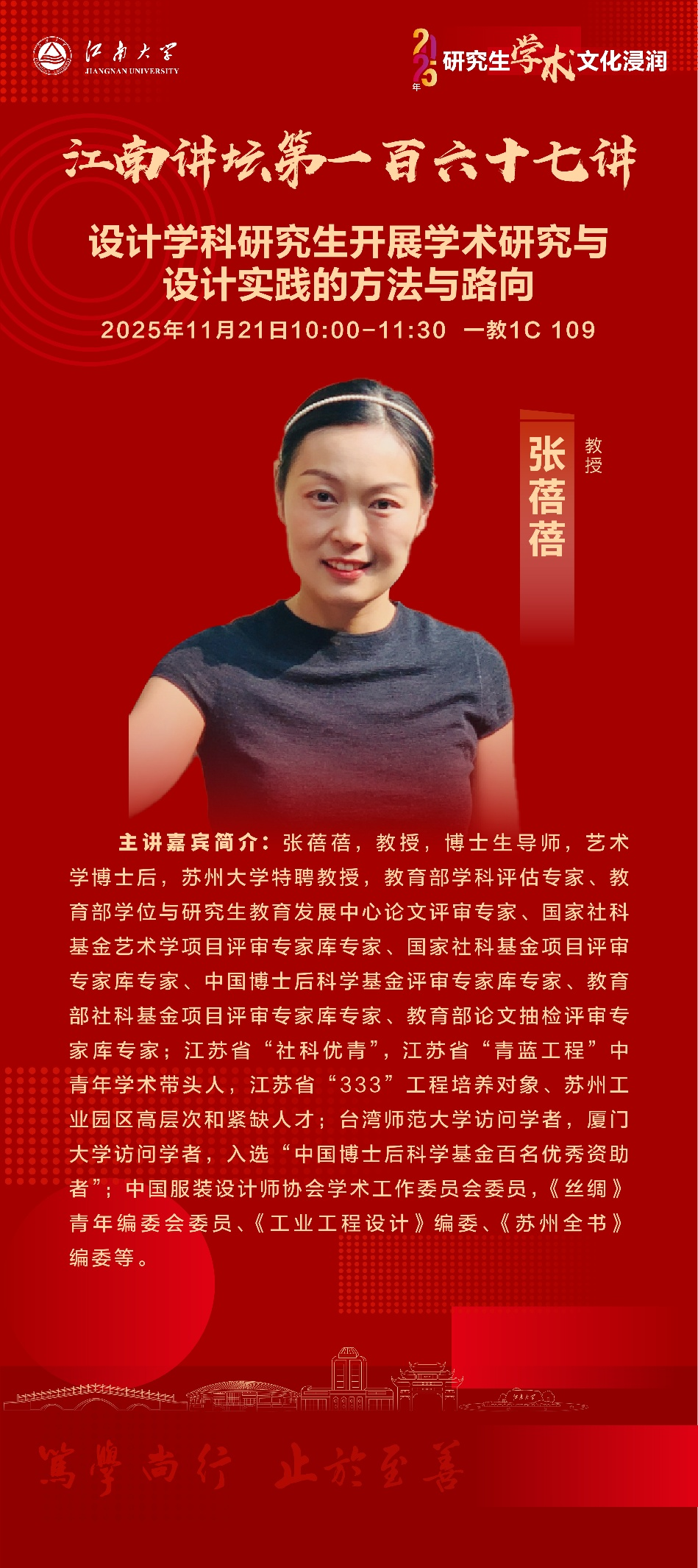 嘉宾简介:张蓓蓓,教授,博士生导师,艺术学博士后,苏州大学特聘教授,教育部学科评估专家、教育部学位与研究生教育发展中心论文评审专家、国家社科基金艺术学项目评审专家库专家、国家社科基金项目评审专家库专家、中国博士后科学基金评审专家库专家、教育部社科基金项目评审专家库专家、教育部论文抽检评审专家库专家;江苏省“青蓝工程”中青年学术带头人,江苏省“333”工程培养对象、苏州工业园区高层次和紧缺人才;台湾师范大学访问学者,厦门大学访问学者,入选“中国博士后科学基金百名优秀资助者”;中国服装设计师协会学术工作委员会委员,《丝绸》青年编委会委员、《工业工程设计》编委、《苏州全书》编委等。