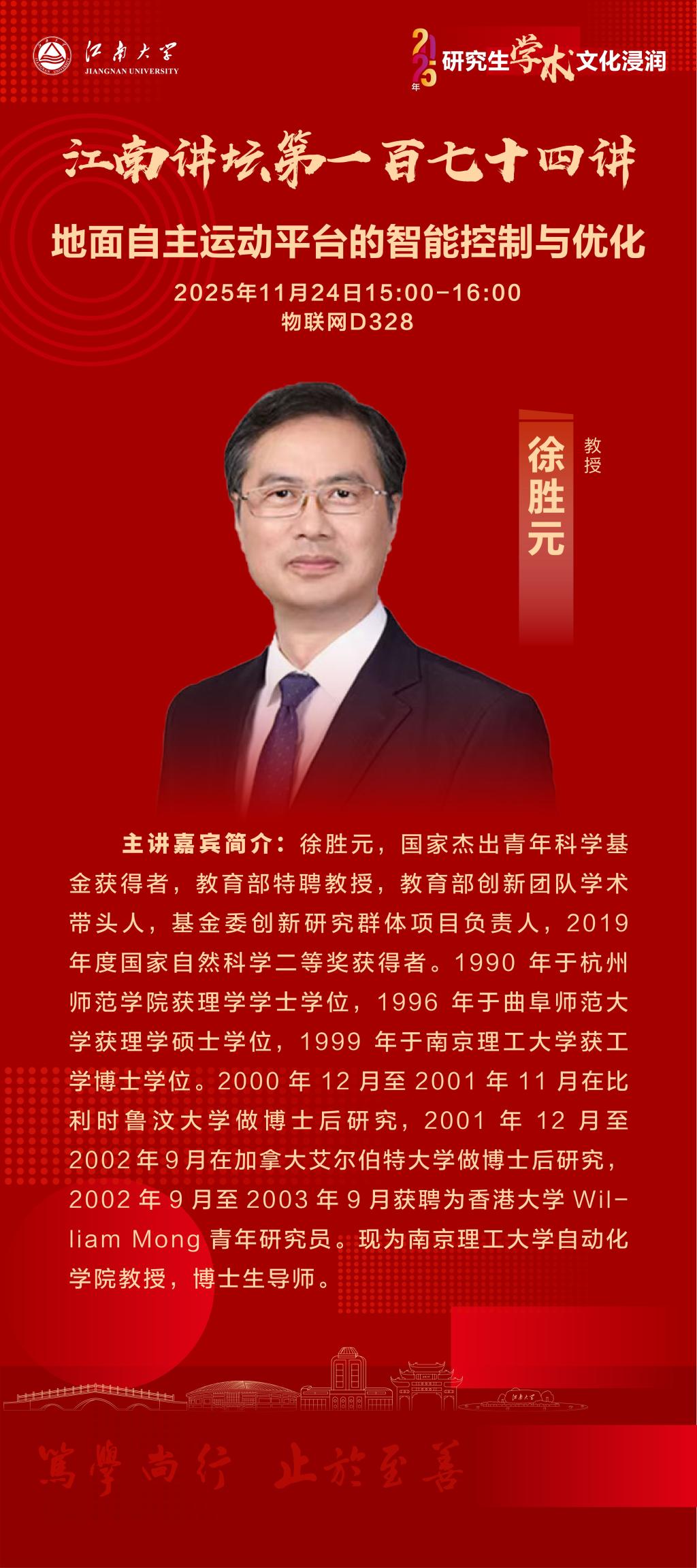 嘉宾简介:徐胜元,国家杰出青年科学基金获得者,教育部创新团队学术带头人,基金委创新研究群体项目负责人,2019年度国家自然科学二等奖获得者。1990年于杭州师范学院获理学学士学位,1996年于曲阜师范大学获理学硕士学位,1999年于南京理工大学获工学博士学位。2000年12月至2001年11月在比利时鲁汶大学做博士后研究,2001年12月至2002年9月在加拿大艾尔伯特大学做博士后研究,2002年9月至2003年9月获聘为香港大学William Mong青年研究员。现为南京理工大学自动化学院教授,博士生导师。讲座简介:地面自主运动平台是指通过平台自身获取环境信息,实现自主导航与控制并独立完成各种任务的自动地面车辆,包括:各类无人驾驶汽车、地面轮式机器人、地面无人战车等,在军事察打一体化、智能交通、灾后救援等军用和民用领域均有着广泛的应用。本报告针对地面自主运动平台存在的系统构成复杂、通信时滞、分布式特性及通信约束等特点,阐述其智能控制与优化理论与方法,为地面自主运动平台的自主创新提供理论支撑。