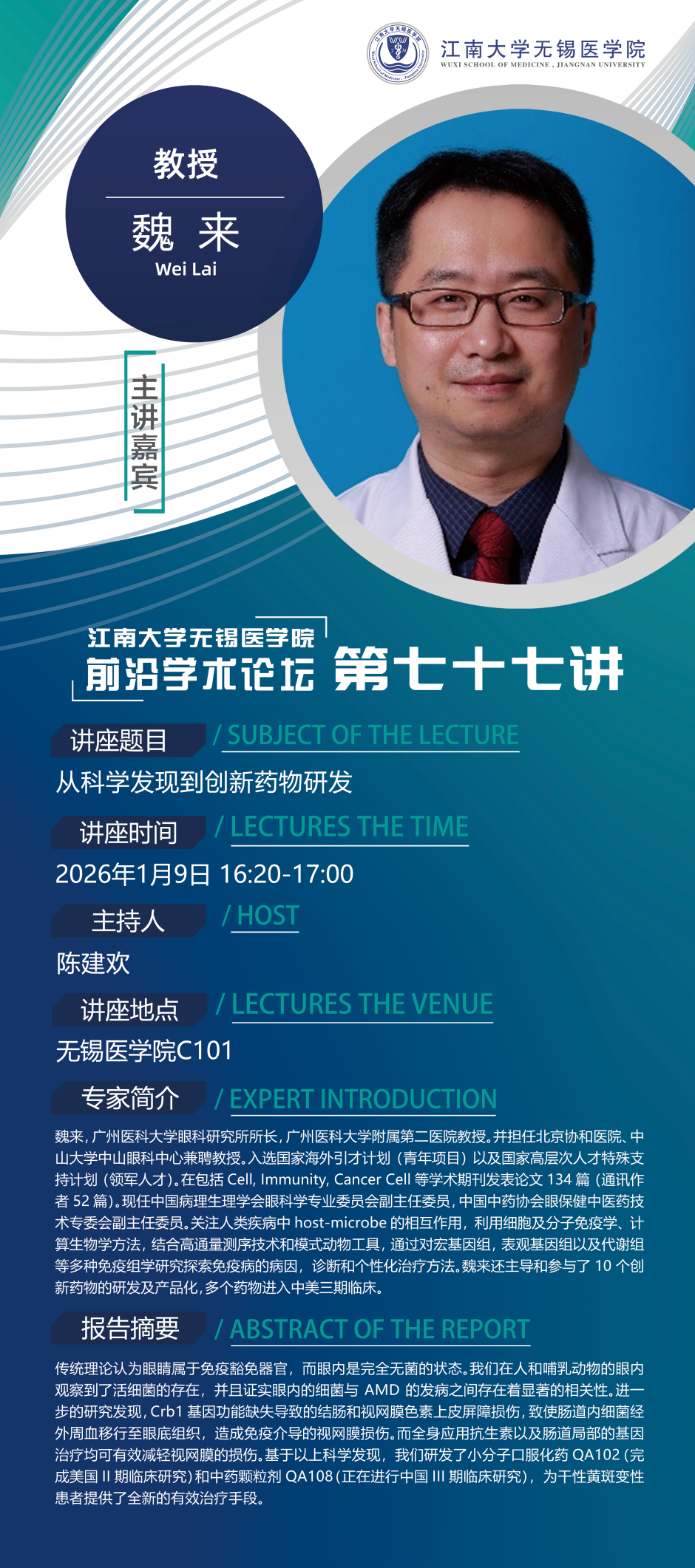 嘉宾简介:魏来,广州医科大学眼科研究所所长,广州医科大学附属第二医院教授。并担任北京协和医院、中山大学中山眼科中心兼聘教授。入选国家海外引才计划(青年项目)以及国家高层次人才特殊支持计划(领军人才)。在包括Cell,Immunity,Cancer Cell等学术期刊发表论文134篇(通讯作者52篇)。现任中国病理生理学会眼科学专业委员会副主任委员,中国中药协会眼保健中医药技术专委会副主任委员。关注人类疾病中host-microbe的相互作用,利用细胞及分子免疫学、计算生物学方法,结合高通量测序技术和模式动物工具,通过对宏基因组,表观基因组以及代谢组等多种免疫组学研究探索免疫病的病因,诊断和个性化治疗方法。魏来还主导和参与了10个创新药物的研发及产品化,多个药物进入中美三期临床。