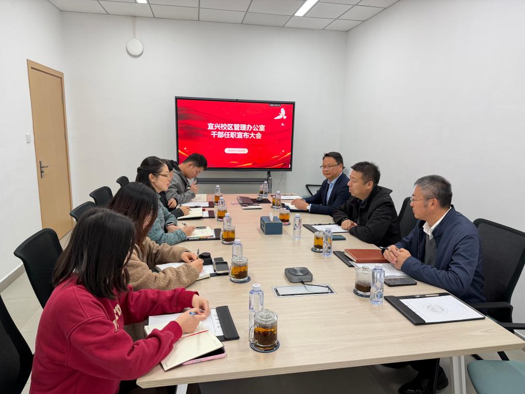 最后,张梁作总结讲话。他强调,宜兴校区是学校“一体两翼”发展战略布局中的重要一翼,关乎学校整体发展大局,肩负着重要的历史责任。希望在潘庆伟同志的带领下,宜兴校区管理办公室全体成员能够快速凝聚合力,全力推进校区各项工作,深化校地、校企合作,切实提升对校区师生的服务保障水平,在学校发展与地方经济社会建设中充分彰显自身价值,作出更大的历史贡献。