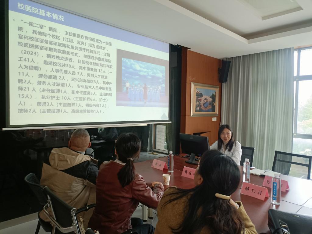10月30日上午,江苏科技大学后勤管理处副处长、后勤集团副总经理居凌云,校医院副院长徐勋淦带队赴我校开展专题调研。我校校医院院长叶军、副院长孙红旭、闫立景及相关科室负责人参与调研,双方围绕校园公共卫生服务体系建设、医疗信息化应用等议题展开研讨。