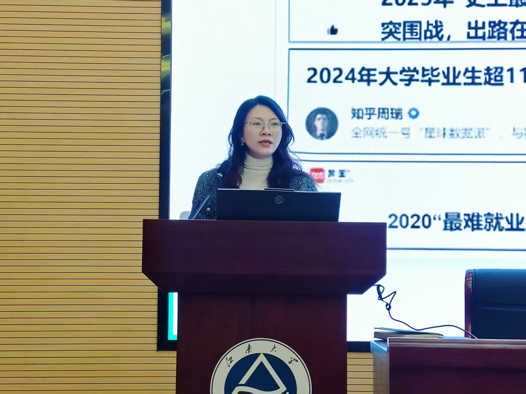 糜海燕首先剖析了当前高校毕业生面临的严峻就业形势与挑战,指出在毕业生人数屡创新高、结构性矛盾突出的“打工人3.0时代”,主动慢就业与被动缓就业趋势并存,加剧了就业预期的复杂性。在考研分析方面,她结合2025届微电子专业本科生的考研数据进行了细致分析,揭示了报考策略、调剂意愿及班级氛围等因素对考研成功率的重要影响,并强调学分绩点与考研结果并非完全正相关,坚定信念与理性选择至关重要。在就业分析方面,她分析了2025届研本毕业生的薪资水平与地域分布,并对第一份工作的选择给出意见建议。她鼓励毕业生沉心静气、坚持积累,向学生重点推荐了长电科技、盛合晶微等一批优质企业,提醒大家积极把握即将到来的校电子信息类专场招聘会机遇。