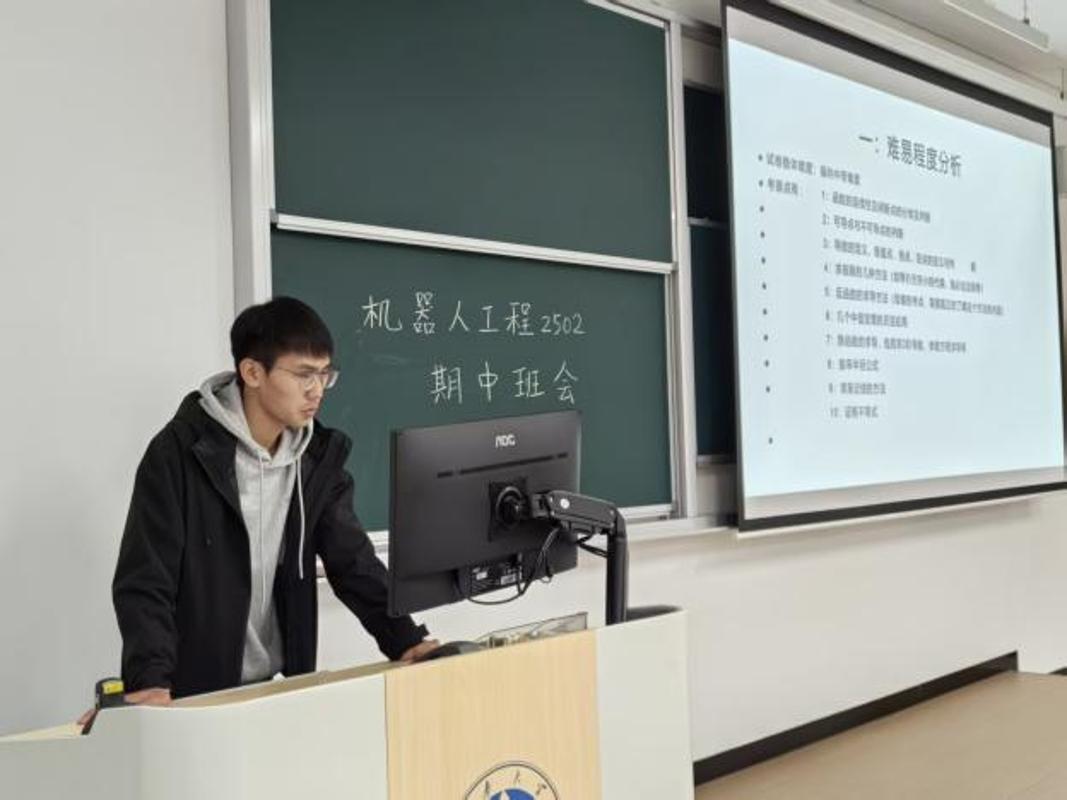 数据驱动,精准复盘学业表现。在本次各班班会的期中考试总结中,各班班主任通过展示两次考试的各分数段人数分布、专业内横向对比等关键数据,并结合辅导员提供的每月晚自习出勤情况做出了班级学习情况分析与指导:智造(创新班)2501班主任蒋毅老师通过对比关键数据,系统分析了班级整体表现,并对优秀、进步同学给予表扬,同时鼓励暂时落后的同学继续努力。机器人工程专业的班主任金光远老师和陈义文老师针对班级线性代数薄弱环节进行了重点解析,提出了具体学习建议。智能制造工程专业的班主任陈琛老师和李可老师则结合学业数据与自习出勤情况,引导同学关注学习习惯与学业表现的关联并通过多维度数据对比,深入剖析了班级存在的共性问题。