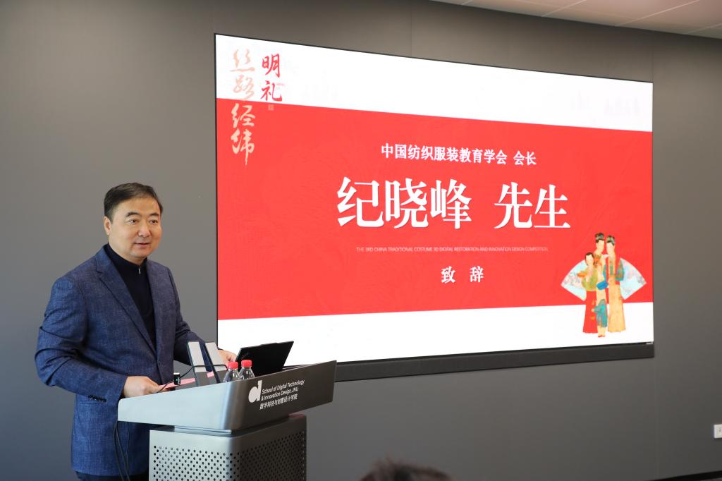 近日,由中国纺织服装教育学会主办、数字科技与创意设计学院承办的“丝路经纬·明礼”【CLO杯】第三届中国传统服饰三维数字复原与创新设计大赛颁奖典礼--暨明代服饰艺术与数字人才培养研讨会在江南大学霞客湾校区举行。中国纺织服装教育学会会长纪晓峰、江阴市相关部门负责人、企业代表、兄弟院校代表、学院师生代表以及来自全国各地的选手参会。活动由数字科技与创意设计学院副院长牛犁主持。