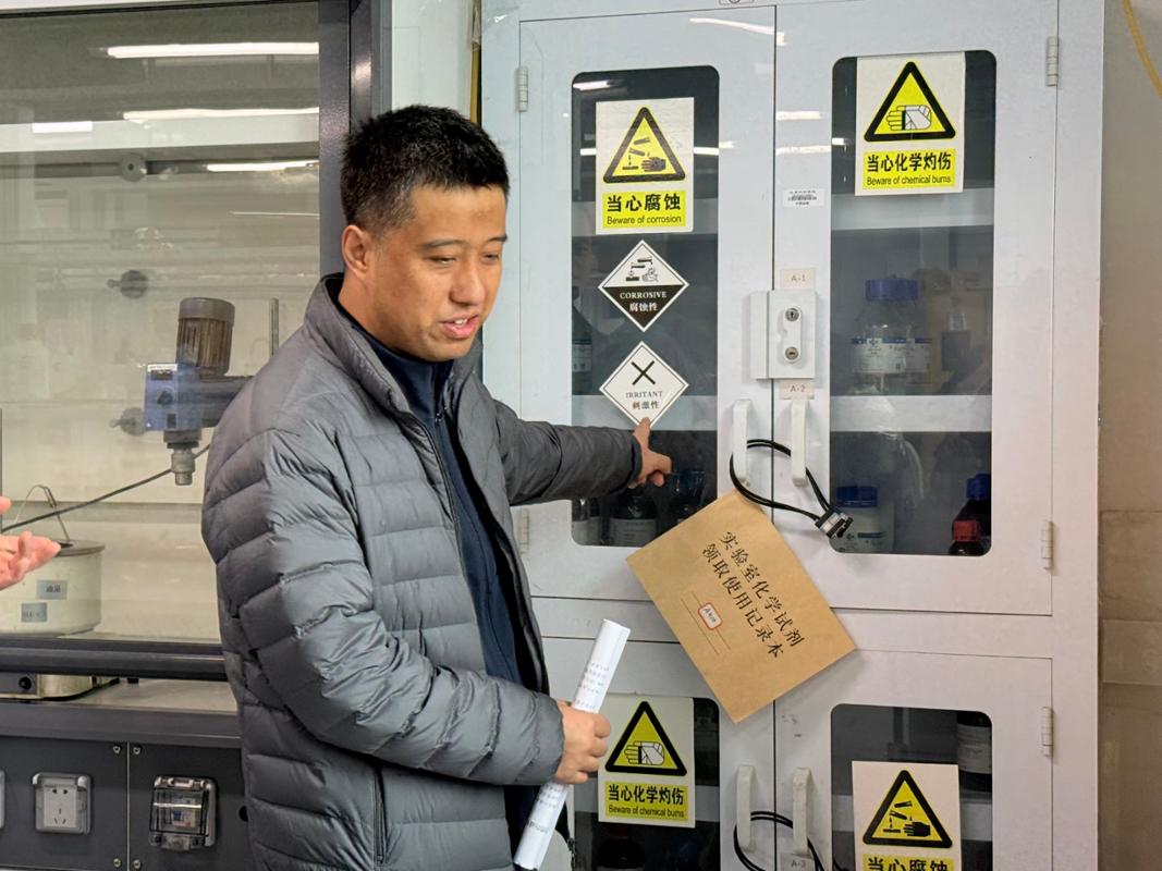 检查过程中,陆敏芝一行详细查看危险化学品台账、试剂储存条件、气瓶检验有效期与安全标识,现场核验设备运行状况与应急防护设施配备情况,对发现的隐患问题现场登记、现场交办,确保隐患整改及时响应、闭环管理。