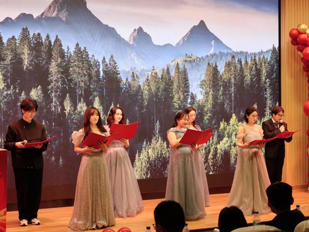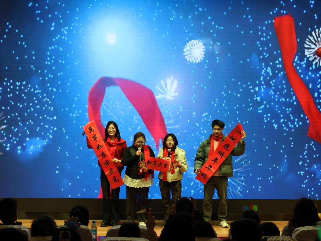 联欢会在同学们欢快合唱的《拜新年》节目中正式拉开帷幕。广大师生积极参演,既有入企学子专程返校带来的精彩表演,也有在校生和推免生献上的各类才艺,更有老师们和兼职辅导员定格的难忘瞬间。同学们的开场舞蹈节奏欢快且充满童趣,引得在场观众忍俊不禁。一曲《倔强》唱出年轻人心中的自信与坚守。学生助理演绎的《是我,也是我们》歌声婉转,寓意悠远。孙子文等师生代表共同朗诵的《卓越之路・江南新章》节奏铿锵有力,充满真挚情感。陈裕老师演唱的《爱拼才会赢》彰显江大卓工人拼搏向上的气质内涵。李雷和沈丹老师深情对唱的《如愿》祝福祖国山河无恙,师生顺遂平安。奚晓岚的一曲《今夜无眠》将晚会气氛推向高潮。吴小俊的吉他弹唱《同一首歌》引发现场师生强烈共鸣,为本场活动画上圆满句号。