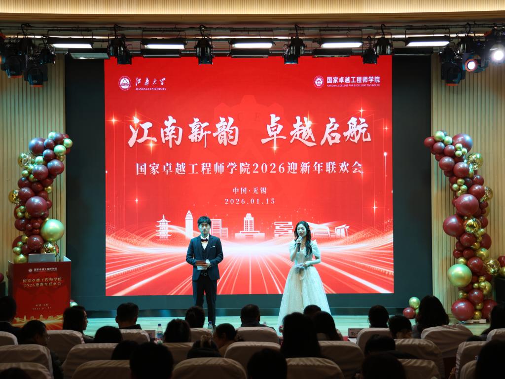 岁序更替,华章日新。1月15日晚,江南大学国家卓越工程师学院举办“江南新韵,卓越启航”2026师生迎新年联欢会。研究生院院长兼国家卓越工程师学院执行院长吴小俊,国家卓越工程师学院党委书记奚晓岚,研究生院副院长兼国家卓越工程师学院副院长潘如如,研究生院副院长陈周,国家卓越工程师学院党委副书记兼副院长李雷、副院长孙子文等领导老师与百余名学子齐聚一堂,在歌声与欢笑中辞旧迎新,共话未来。
