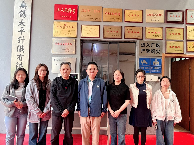 在无锡太平针织有限公司,调研团队看望在此实践的李慧建、刘颖同学,并与公司总经理蔡晨原及学生行业导师、公司技术部经理黄娴座谈交流。蔡晨原介绍企业与江南大学纺织学科在高端运动针织面料研发上的紧密合作成果,并带领调研团队实地参观生产车间中“一根纱线进去,一件成衣出来”的智能制造场景。李雷对企业为在校研究生提供接触国际前沿技术与高端研发平台的宝贵机会表示感谢,并鼓励驻企学子珍惜在行业头部企业的一线实践经历,将专业所学与产业痛点紧密结合。