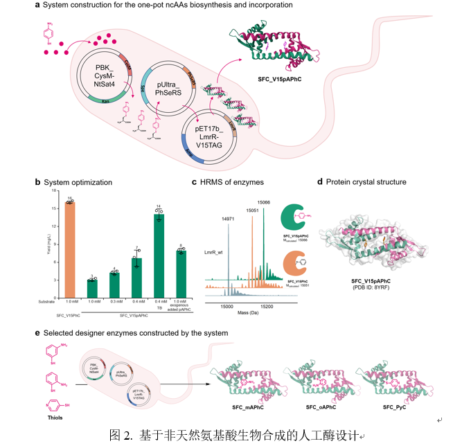 本研究通过整合S-芳香基半胱氨酸生物合成系统、兼容的正交翻译系统和目标蛋白质表达系统,创建了用于原位生物合成非天然氨基酸的人工酶。作者通过将三个质粒(分别编码工程化CysM、OTS 和LmrR整合到大肠杆菌中,构建了人工酶表达系统。作者只需在培养基中添加ncAA前体底物,细胞工厂便可自动产生含有pAPhC残基的人工酶SFC_pAPhC。通过进一步优化细胞生长条件(如培养基、温度和前体浓度),SFC_V15pAPhC的表达水平提升至14 mg/L。为验证该系统的兼容性,作者成功构建了含非天然mAPhC、oAPhC和PyC的多种含硫醇类ncAA人工酶。这些结果表明,该体系提供了一种高效便捷的人工酶设计策略,并在建立多样化人工酶库方面展现出巨大潜力(图2)。