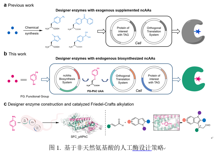 在合成生物学与生物催化领域,如何让蛋白质具备自然界不存在的全新催化活性并执行非天然化学反应,是科学家长期追求的目标。将携带特殊官能团的非经典氨基酸引入蛋白质是实现人工酶设计的重要策略,但传统方法通常依赖化学合成后外源添加非经典氨基酸,这种方式成本高,细胞利用效率低,并受到膜通透性和潜在毒性的限制。如何让细胞自身合成并利用非经典氨基酸,从而在体内完成人工酶的装配,是长期悬而未解的难题。