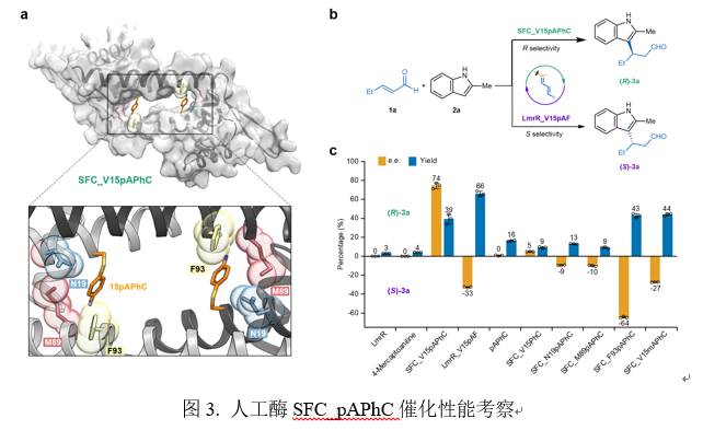 为了验证SFC_pAPhC的催化活性,作者选择通过亚胺催化机制研究吲哚与不饱和醛的不对称Friedel-Crafts烷基化反应。SFC_V15pAPhC催化1 mM 2-甲基吲哚和5 mM反式-2-戊烯醛,获得74%对映异构体过量值(e.e.)和39%产率,其构型为R型。值得注意的是,与先前报道的人工酶LmrR_pAF相比,本研究设计的SFC_V15pAPhC在催化同样的反应中表现出相反的对映选择性,这些结果表明硫原子的引入导致SFC_V15pAPhC与LmrR_V15pAF在反应活性和立体选择性方面产生显著差异(图3)。