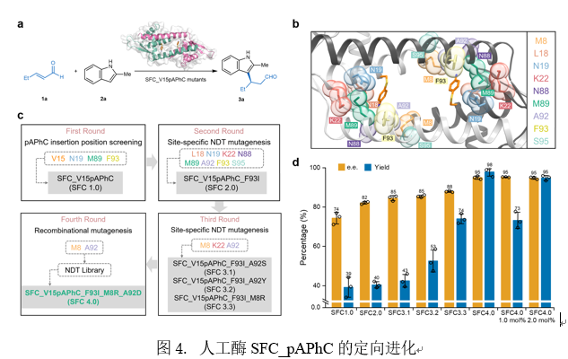 基于SFC_V15pAPhC所展现出的良好对映选择性和活性,作者采用了迭代定点突变策略来优化人工酶。通过晶体结构指导(PDB: 8YRF),首先采用丙氨酸扫描法系统评估了催化位点周边残基在Friedel-Crafts反应中的催化作用。经过三轮组合突变进化与反应参数优化,最终获得最优突变体SFC4.0(SFC_V15pAPhC_IRD),其对映选择性达95% e.e.,产率达98%。动力学分析表明,进化后的SFC4.0突变体催化效率达0.64 ± 0.22 M⁻¹ s⁻¹,较SFC1.0(0.12 ± 0.04 M⁻¹ s⁻¹)提升5.5倍,证实定向进化策略显著增强了酶催化性能(图4)。